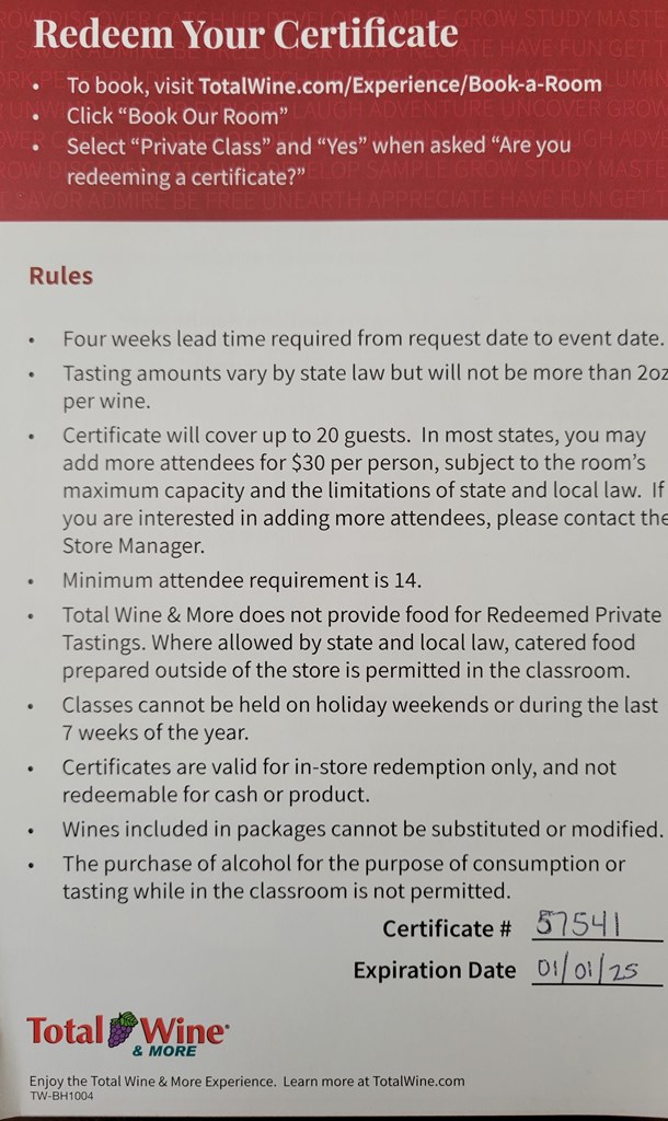 Private Wine Class for 20 Treat your friends, family, and fellow wine lovers to a private wine tasting for up to 20 people in the classroom of our store. Total Wine & More will host an event that is certain to impress you and your guests. Enjoy a tour of the land and learn about the famed appellations and grape varietals that make each region so unforgettable. Taste a variety of our premium, hand-selected wines and discover hidden treasures from the wine region of your choosing. One of our wine experts will present and discuss each delicious wine during your two hour class, which can be arranged as a seated class-style or more casual walk-around event. Total Wine & More will provide all necessary stemware and educational handouts for tasting notes. Value - $500 Choose from one of our popular themes. Wine 101: In Vino Veritas - Identify key components of wine and explore how to pair with the right food to make your next dinner party a success! Beautiful Blends: The Most Carefully Crafted Wines - Join us to explore the art of the blend, from easy-drinking domestic reds to the great white wines of Bordeaux and the Rhone. New World, New Wines: Exploring the Southern Hemisphere - Discover how the Old World’s native grapes and long wine-making traditions have helped shape how we make and enjoy wine all over the world. Vive La France - Explore the greatest wine-making regions in France so you can master our wine aisles and any restaurant wine list! Into the Wild: Walla Walla Willamette & Pacific Northwest - Take a tour of the Pacific Northwest! Learn about the very best from Washington Wine Country to Willamette Valley, Oregon. From Tip to Toe: A Wine Tour of Italy - Explore many distinctive wines of Italy, from sparkling Proseccos and crisp Pinot Grigios to the Sangiovese-based wines of Tuscany to rich, dark reds of Sicily. California Uncorked: Napa Valley & Beyond - Explore the red and white wines that have brought acclaim to Napa Valley, Sonoma, Amador and the Central Coast. Here’s to Bottles that Pop: Great Sparkling Wines - Nothing is better than a bottle of bubbly! Learn about our favorite sparkling styles, food pairings and, of course, champagne! *PLEASE NOTE: If this certificate is redeemed in one of our New Jersey stores, customers will only taste four wines by state law instead of eight. Also, It is important for the recipient to be given the original certificate to ensure they understand the redemption policy for the Private Wine Class.* To redeem this certificate, please visit https://totalwine.eventready.com/eventrequest. Under What type of event would you like to host? select Private Class and answer the subsequent questions. Classes cannot be held on holiday weekends or the last seven weeks of the year. Four weeks notice required from request date. This certificate may be redeemed at any of our stores with a classroom.