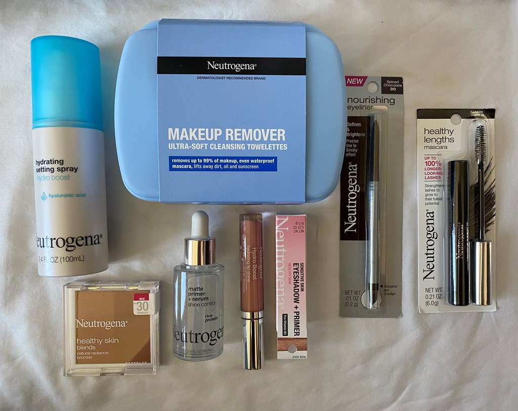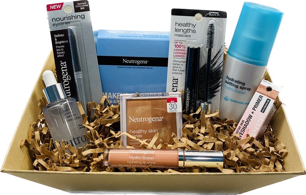 Neutrogena Make-Up Basket with 8 items - Nourishing eyeliner (spiced chocolate) - Healthy lengths mascara (carbon black) - Hydro boost hydrating lip shine (true nude) - Sensitive skin eyeshadow + primer (rose gold) - Healthy Skin blends bronzer (sunkissed) - Matte primer + serum (1 oz) - Hydro boost hydrating setting spray (3.4 oz)
