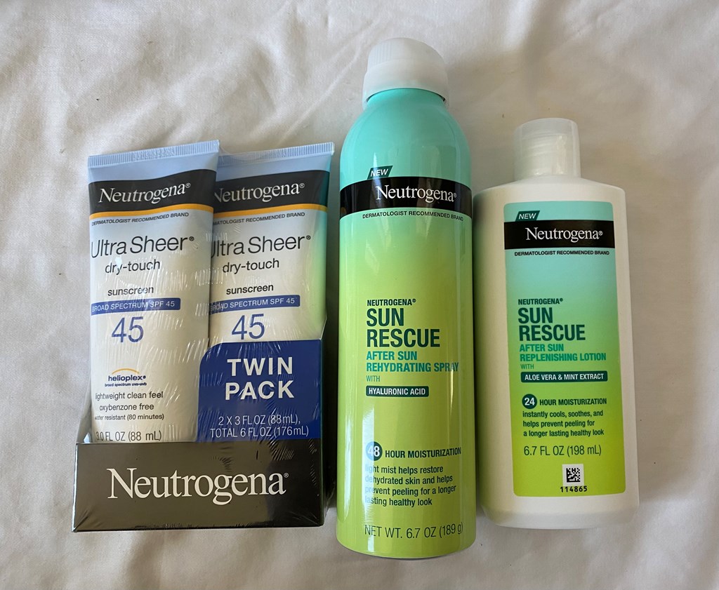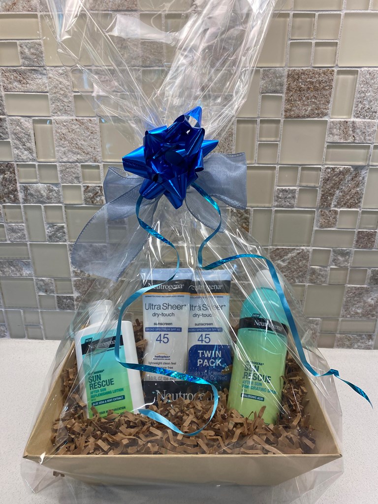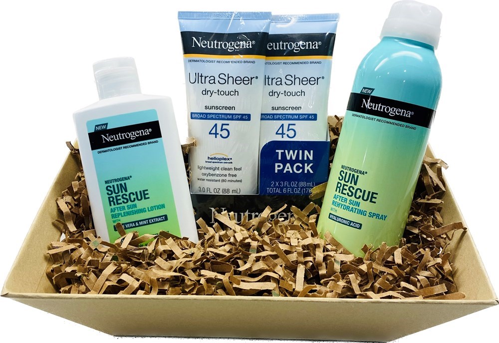Neutrogena Fun-in-the-Sun basket with 4 items: - Sun Rescue after sun rehydrating spray (6.7 oz) - Sun Rescue after sun replenishing lotion (6.7 oz) - Ultrasheer dry-touch sunscreen twin pack (3 oz each)