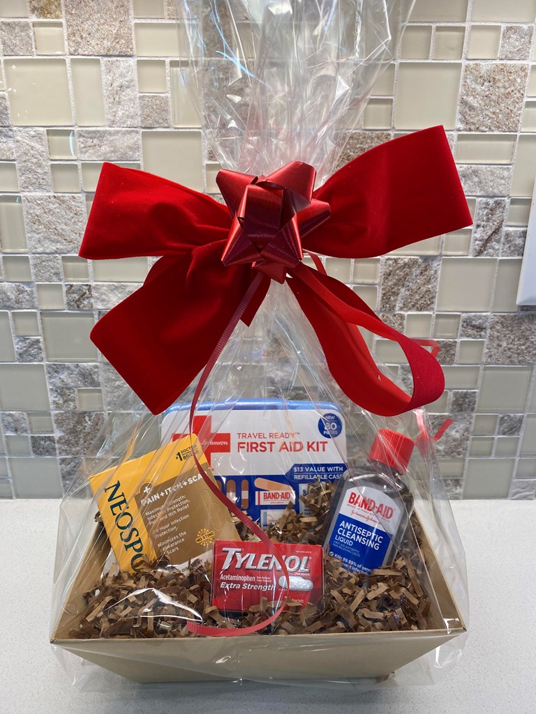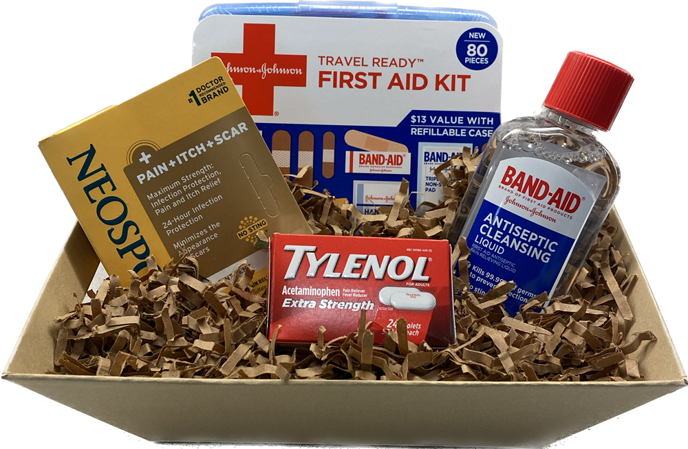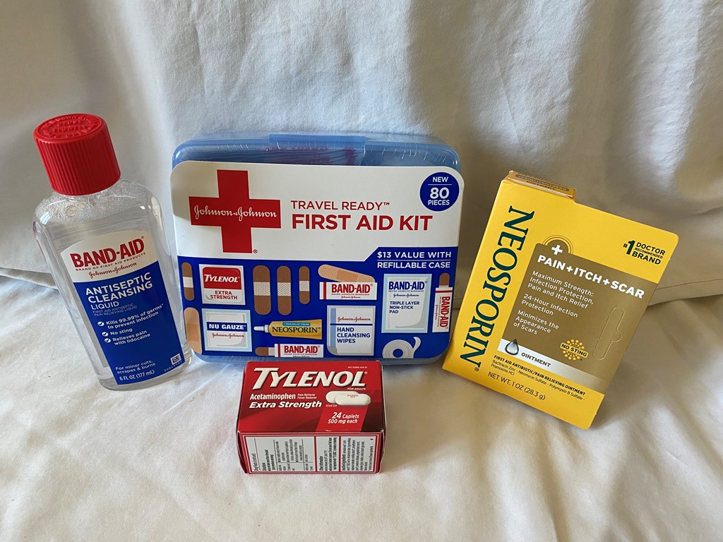 Johnson & Johnson First aid basket with 4 items: - Travel Ready First Aid Kit with 80 pieces - Neosporin antibiotic/pain relieving ointment (1 oz) - Band-aid antiseptic cleansing liquid (6 oz) - Tylenol extra strength (24 caplets)