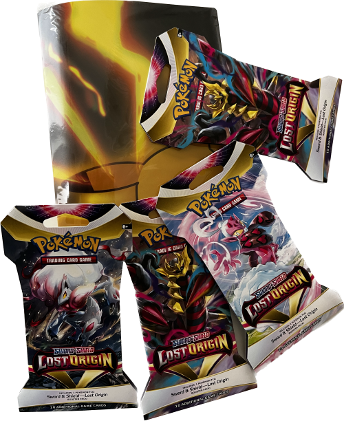 - 1x Pokemon trading card binder (4 pocket 256 cards) -4x random sleeved Pokemon Sword and Shield Lost Origin booster packs - Each pack contains 10 cards