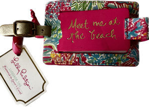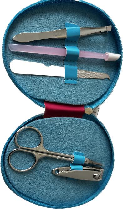 Four travel essential items: -1 x Clinique moisturizing lip gloss (4/set) -1 x luggage tag -1 x hand purse -1 x nail manicure kit