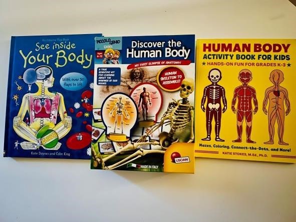 -Human body activity book for kids (grades K-3) -Usborne flap book- See Inside Your Body (with over 50 flaps to lift) -Science kit- Discover the Human Body (ages 6-12)