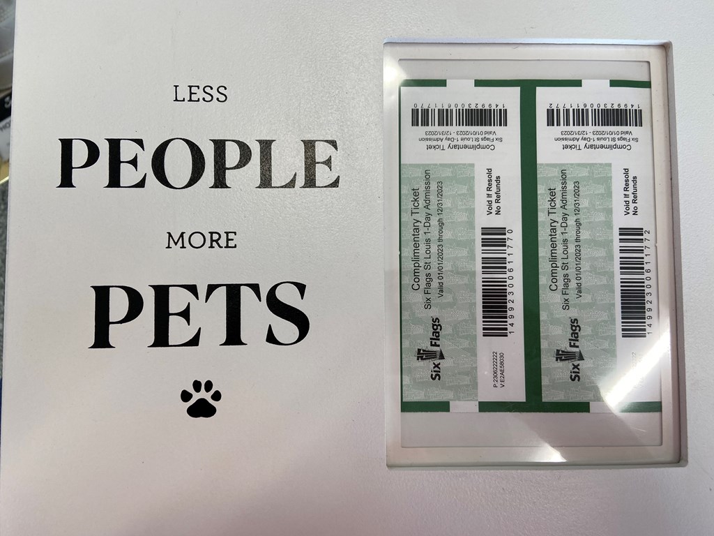 (4) Super Six Combo Admissions (Includes access to Aquarium, Mirror Maze, Wheel, Selfie Express, Mini Golf & Carousel) This certificate is not valid for walk-up use. Non-transferrable. Certificate is inclusive of tax. A minimum of 14 days’ advance notice is required for Aquarium admissions. Reservations Only. If won, please collect the item before you leave. "Less People, more Pets" frame with two tickets for "Free Admission" to Six Flags- Expire 12/31/23 2 candles with candle lighter.