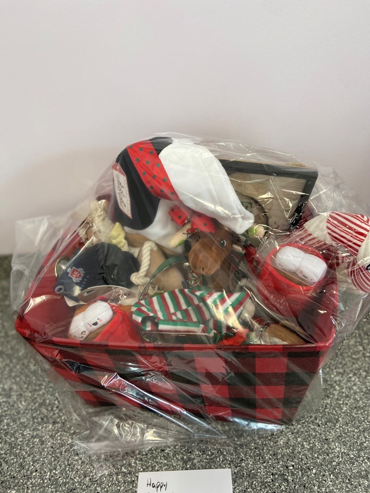 Assortment of 8 dog toys, stocking, collar and leash, scarf, and home decor sign.
