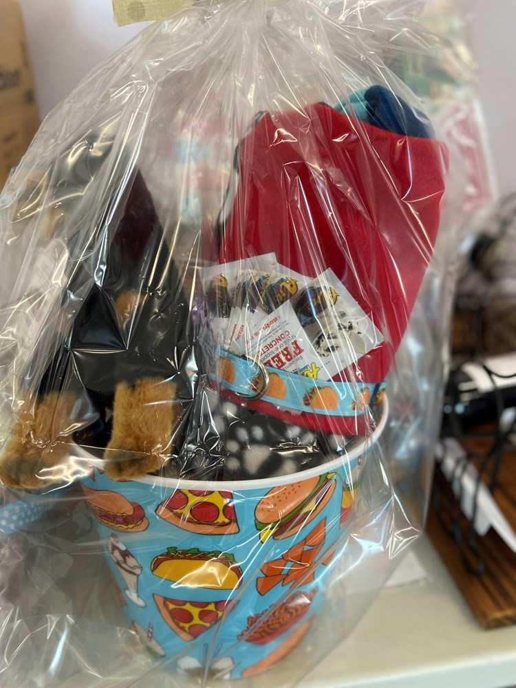 Dog blanket, 6 free concretes from Andy's Frozen Yogurt, stuffed dog and dog collar.