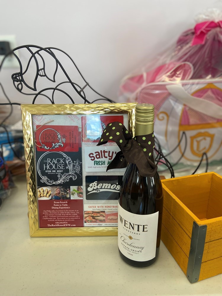 $50 to Rack House, $25 Salt's Fresh Mex, $50 Bemo's, Bottle of Chardonnay, Dog wine rack, 6 free sandwiches at Honey baked ham co.