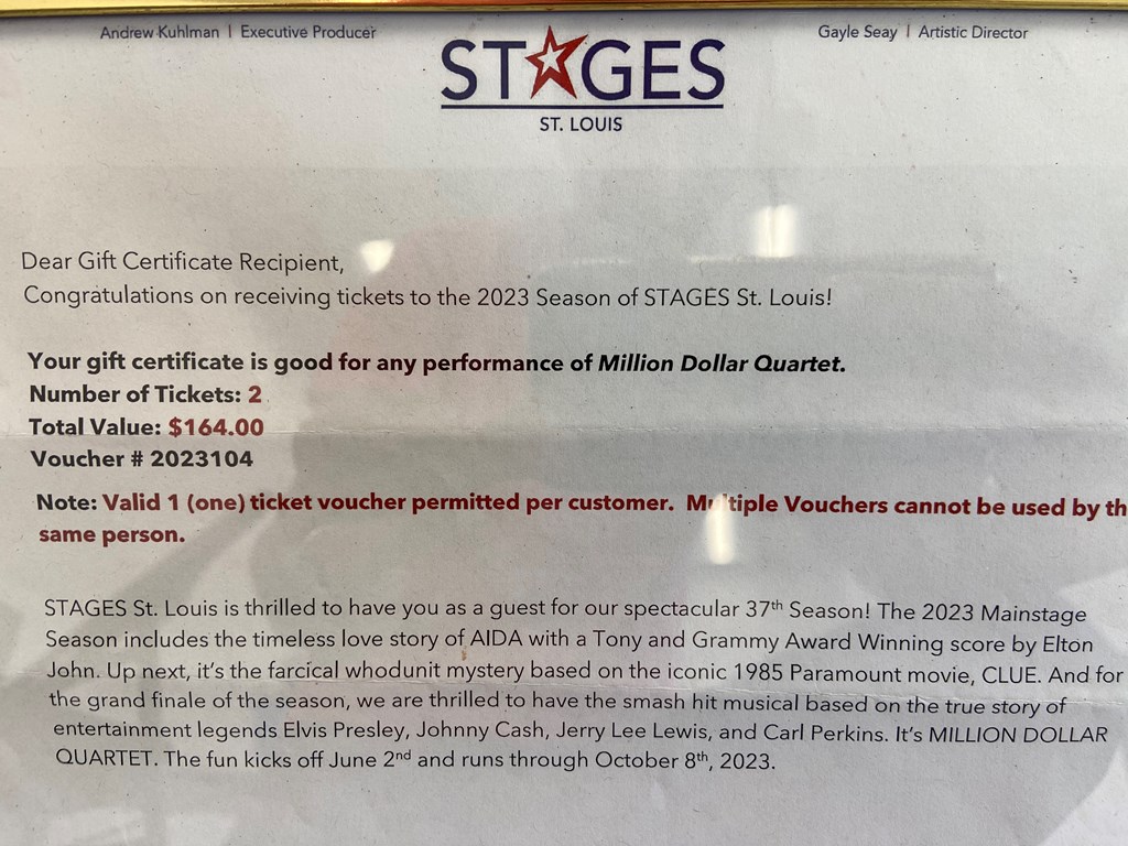 Box of four Brick House Cigars: Mighty Mighty Classic Mighty Mighty Maduro Toro Double Connecticut Robusto Classic 6 Cedar Cigar Baccarat Cigar Boxes Two Ticket to Stages St. Louis- to any performance of "million Dollar Quartet". Must be used by 10/8/2023