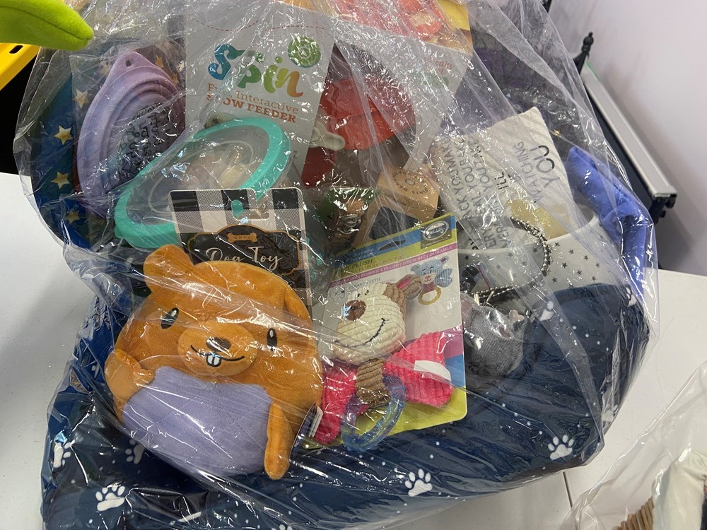 Dog bed, assortment of toys, slow feeder spin bowl, jar of dog treats, dog bowls, portable dog bowl, collar, dog leash, two assorted cookie bags, human t shirt.