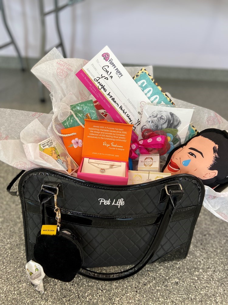 Pet life pet carrier travel bag, Jewels with a Purpose sterling silver necklace, two "Dogs are the Best People" pins, pet magnet, 3 doggie macaroons, Kardashian dog toy, accessory collar flower, "Good Gracious" sign, Three collars, coin purse, YP 2 Night Luxury Pet Hotel Stay.