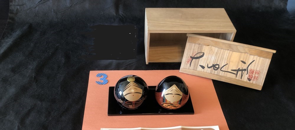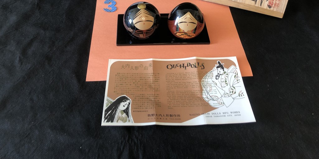 Set of 2 Japanese Ouchi dolls, Emperor and Empress; approx. 3-4" tall; with original wooden box and original literature. (IMG_3102.jpg)
