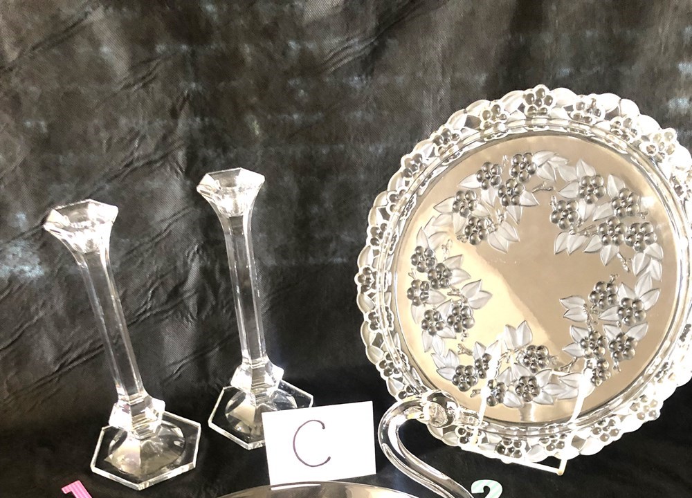 Pair of vintage crystal glass candlesticks approx. 8" tall; crystal glass platter approx. 14" across; vintage clear blown glass serving dish approx. 10"x8"x8".(IMG_3115.jpg)
