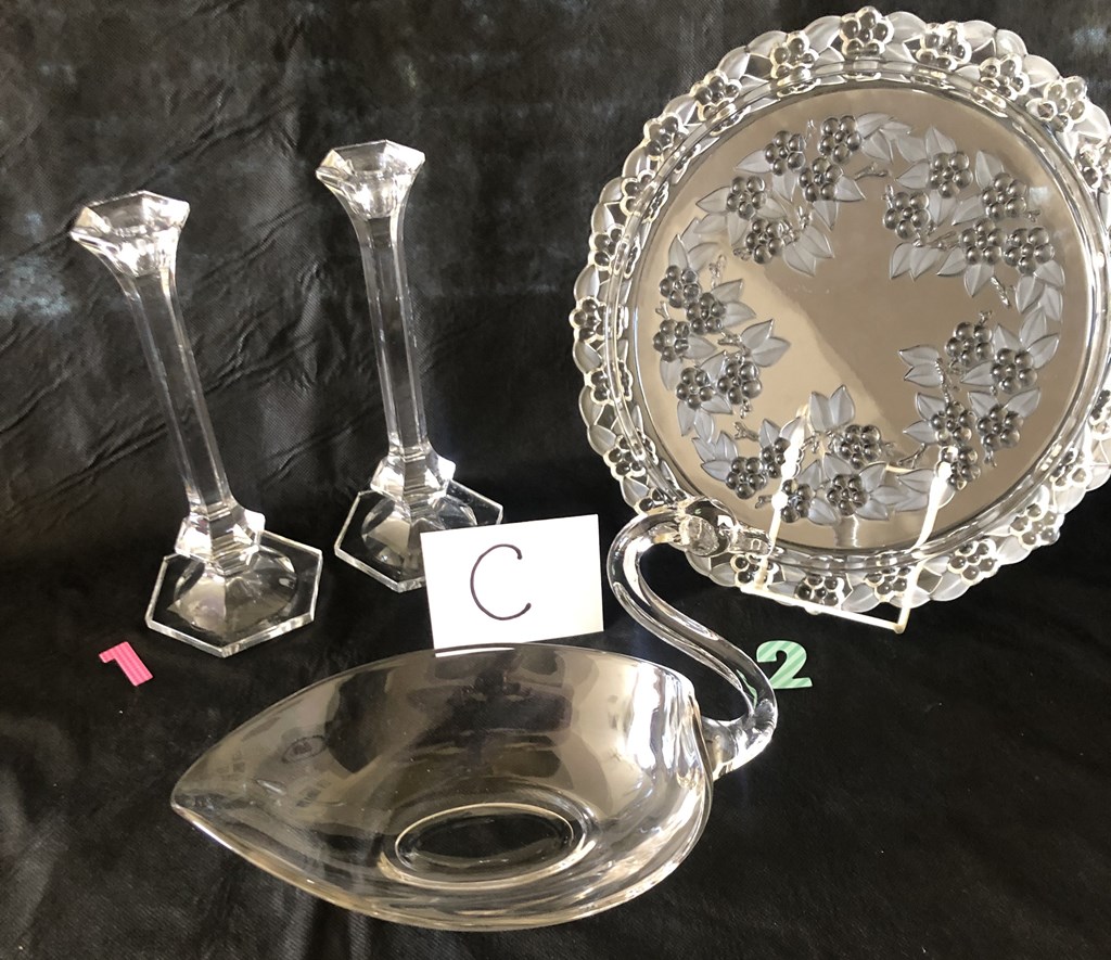 Lead Crystal Candlesticks & Platter; Blown Glass Swan Serving Dish