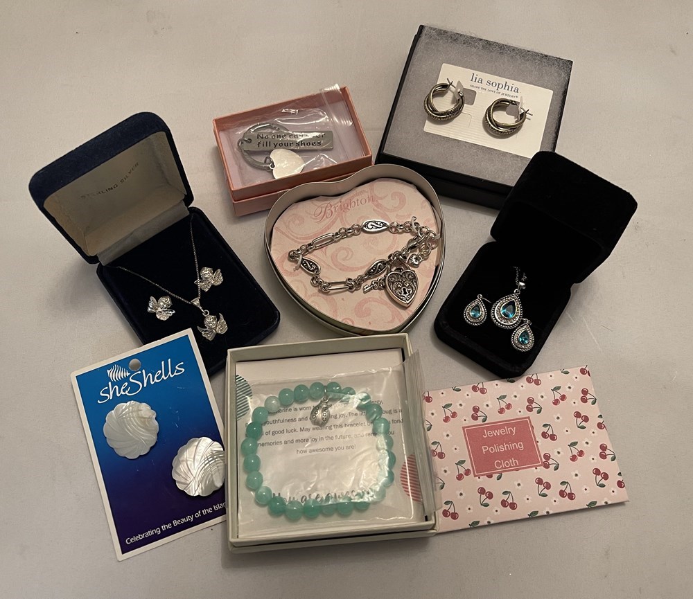 Brighton Lock Heart w/ Key Chain Bracelet Lia Sophia Small Hoop Earrings Silver and Blue Necklace and Earring set She Shells Earrings Sterling Silver Angel Earrings and Necklace Beaded Bracelet w/ Ladybug Charm Silver Keychain Jewelry Polishing Cloth
