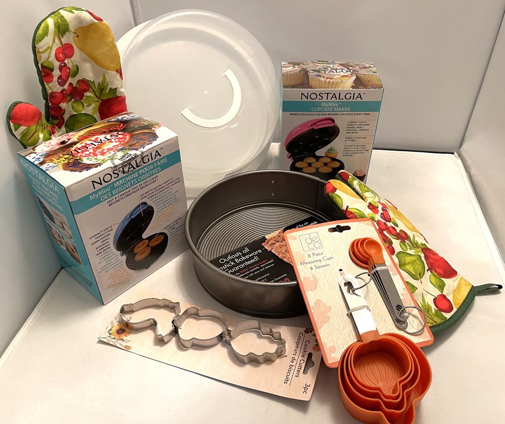 Fall 8 Piece Pumpkin measuring cups and spoons 3 Piece Leaf Cookie Cutters (1) Non-Stick 8" Cake Pan (1) MyMini Nostalgia Donut Maker (1) MyMini Nostalgia Cupcake Maker (1) Cake Carrier (1) Set of Oven Mitts