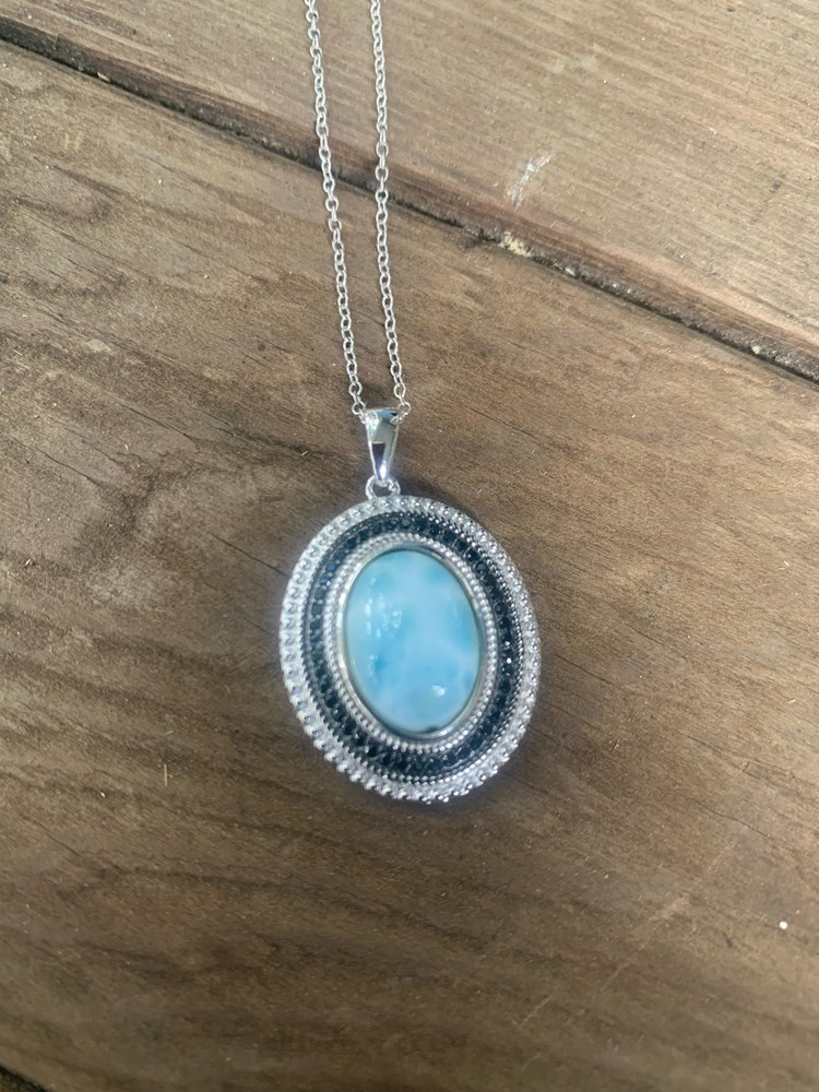 Sterling Silver pendant and chain. Oval Cobochon Larimar surrounded by .25 total carat weight Black Spinel Stones. 18' chain.