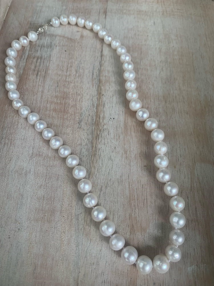 Hand knitted pearl strand- 9/10 millimeter Cultured Freshwater pearls in WHITE color, sterling silver clasp, 22 inches long.