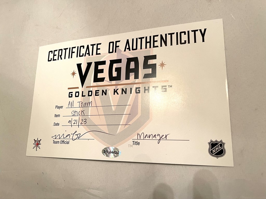 Vegas Golden Knights 2022-2023 Stanley Cup Winning Team Signed Hockey Stick With Certificate of Authenticity Certificate of Authenticity with #27 signed puck 2021-2022 season