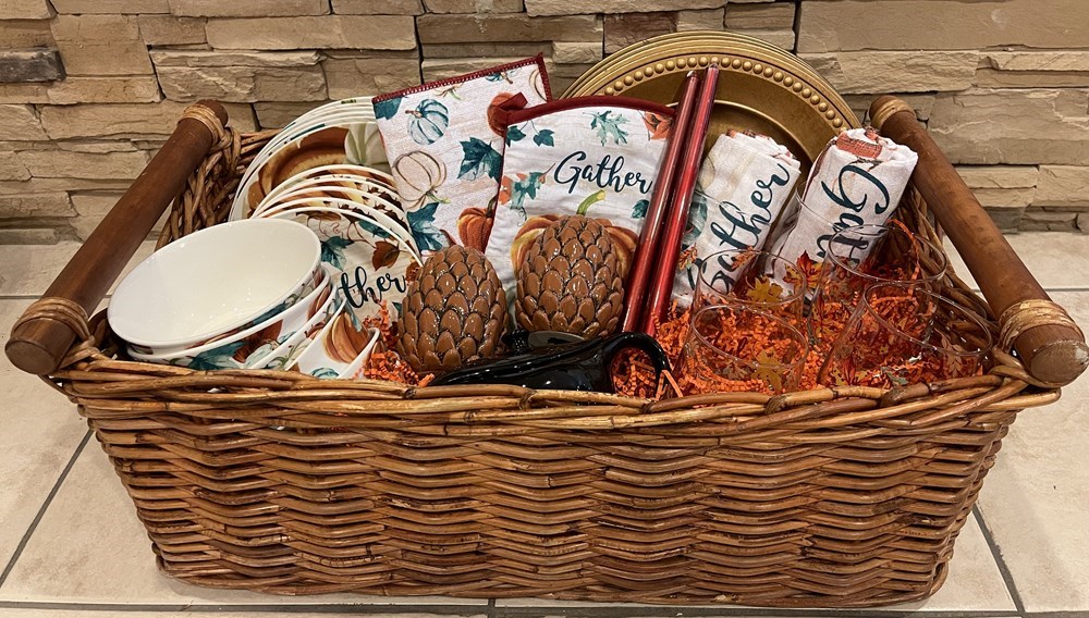 Matching Set Of 6 dinner Plates, 6 Appetizer Plates, 6 Salad Bowls, 6 Tumblers, 6 Gold Chargers, 2 Candles w/ Ceramic Pinecone Candle Holders, 2 dish cloths, 1 Oven mitt, 1 Drying Mat, 1 Electric Gravy Boat