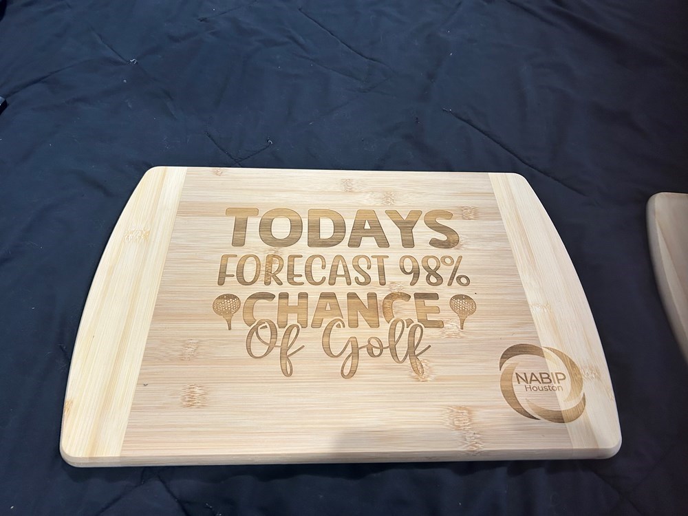 Custom NABIP charcuterie board (front) and cutting board (back). Non-perishable food items also included (but not pictured) are sausage, crackers, olives, fruit jam. If the winning bidder is not at the golf tournament, someone from the NABIP-HTX board will reach out no later than May 2nd to coordinate picking up your auction item.