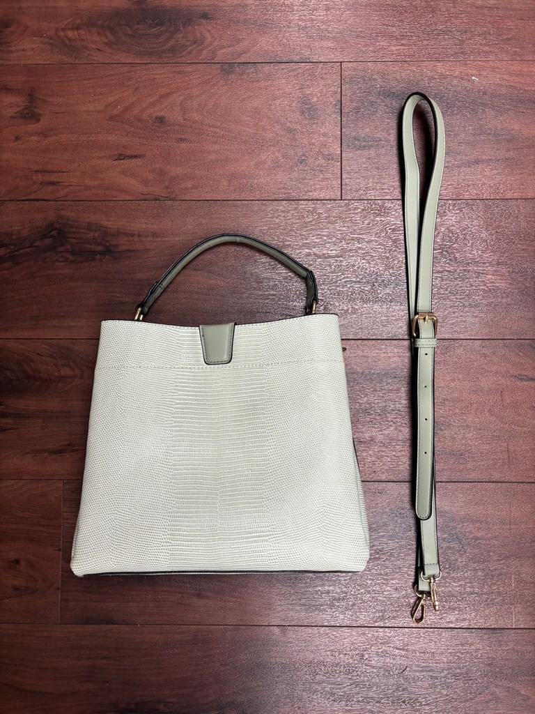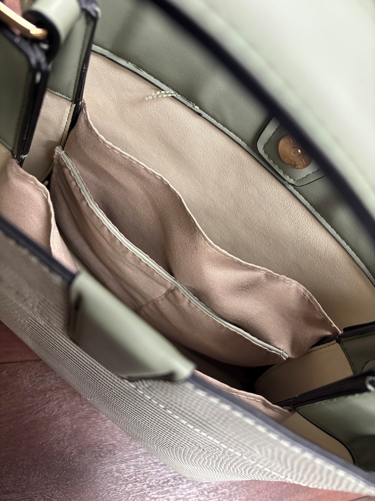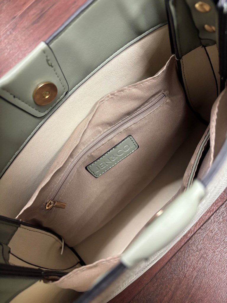 Sage green Jen & Co leather purse with a detachable strap. Three pockets in the inside and one has a zipper. Closes with magnet at the top. In very good condition with no strains or tears!