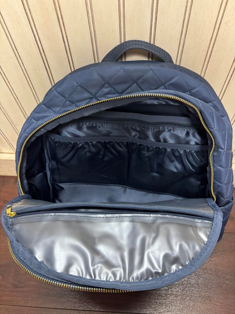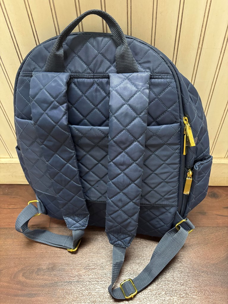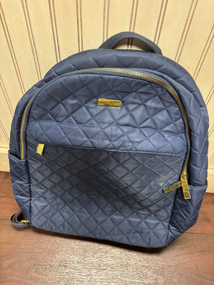 Joy & IMAN navy plushy backpack with two side pockets, one front zipper pocket, and with 5 inside pockets. Backpack straps and one pocket in the back. In very good condition, with no rips or stains!