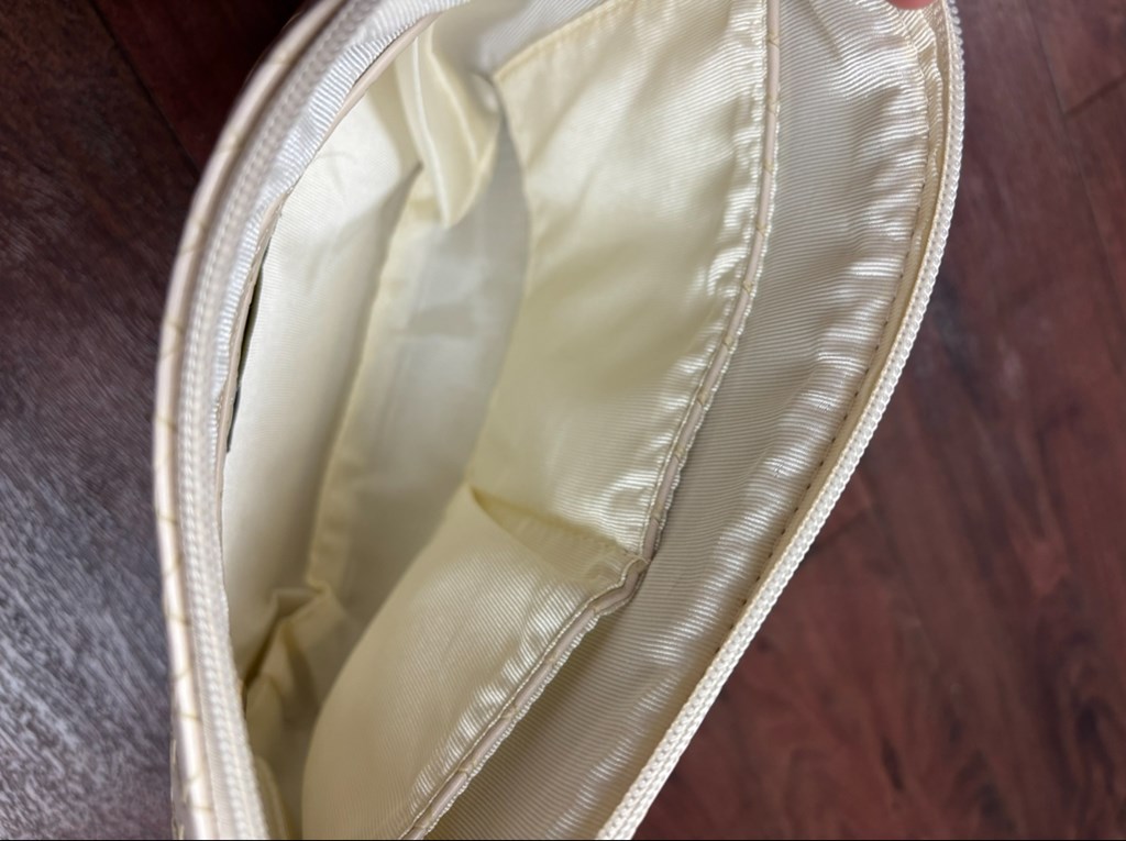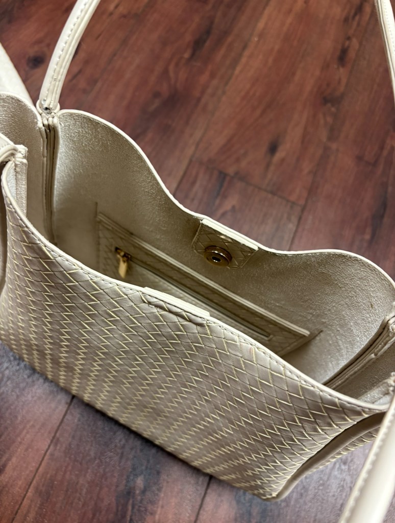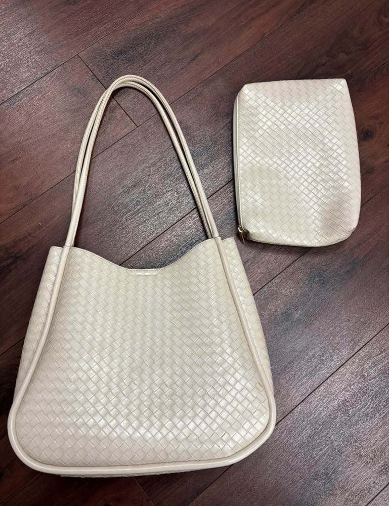 This braided off-white purse comes with a makeup bag and both have several pockets and zippers to store things in. Very good condition, no stains or tears.