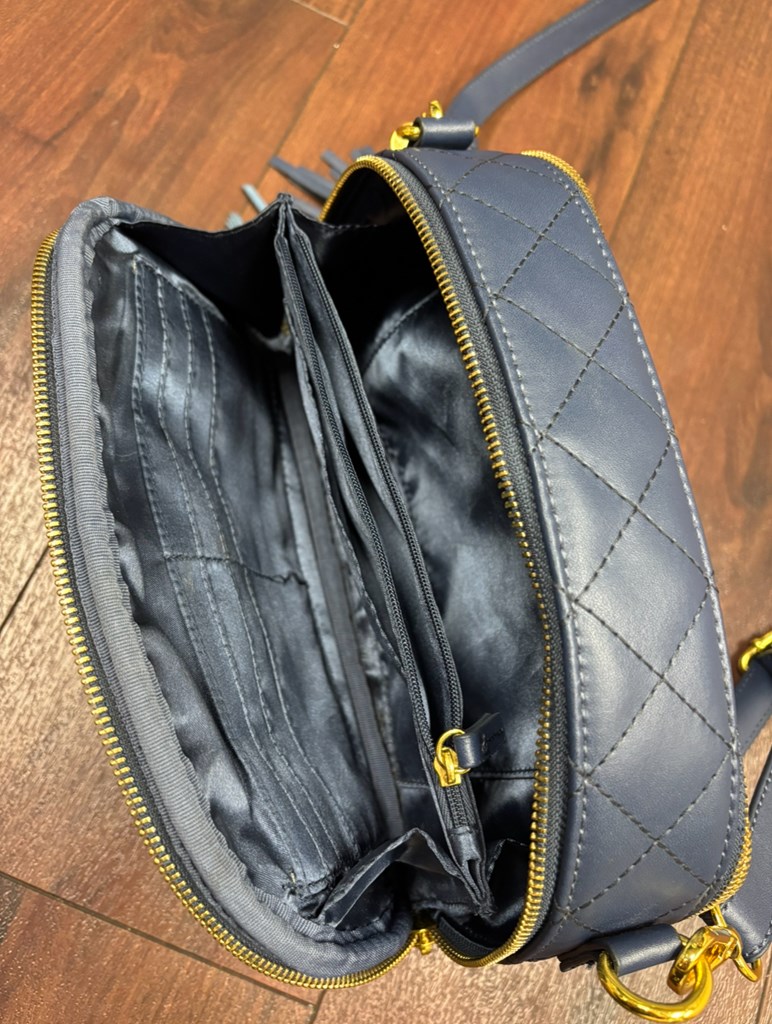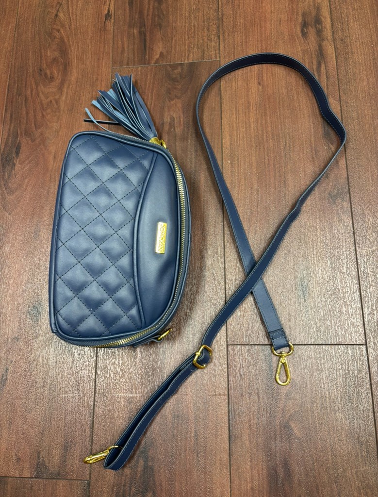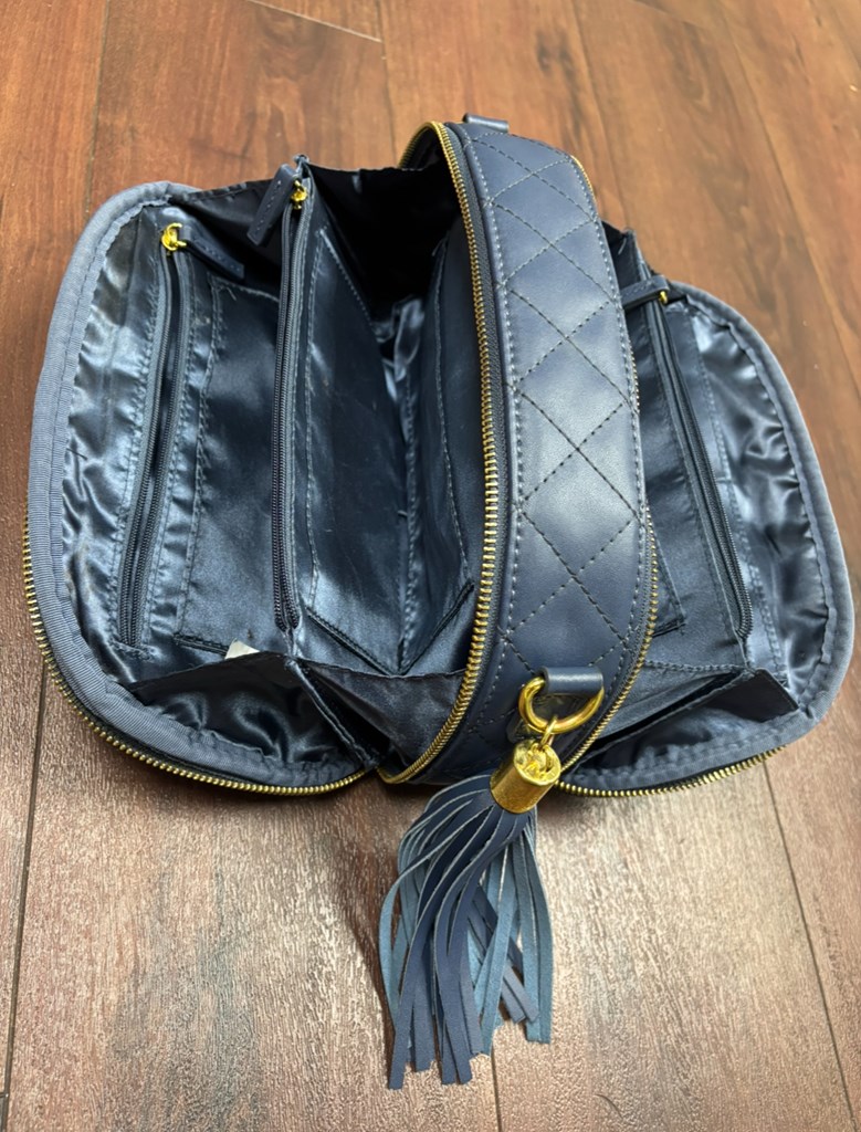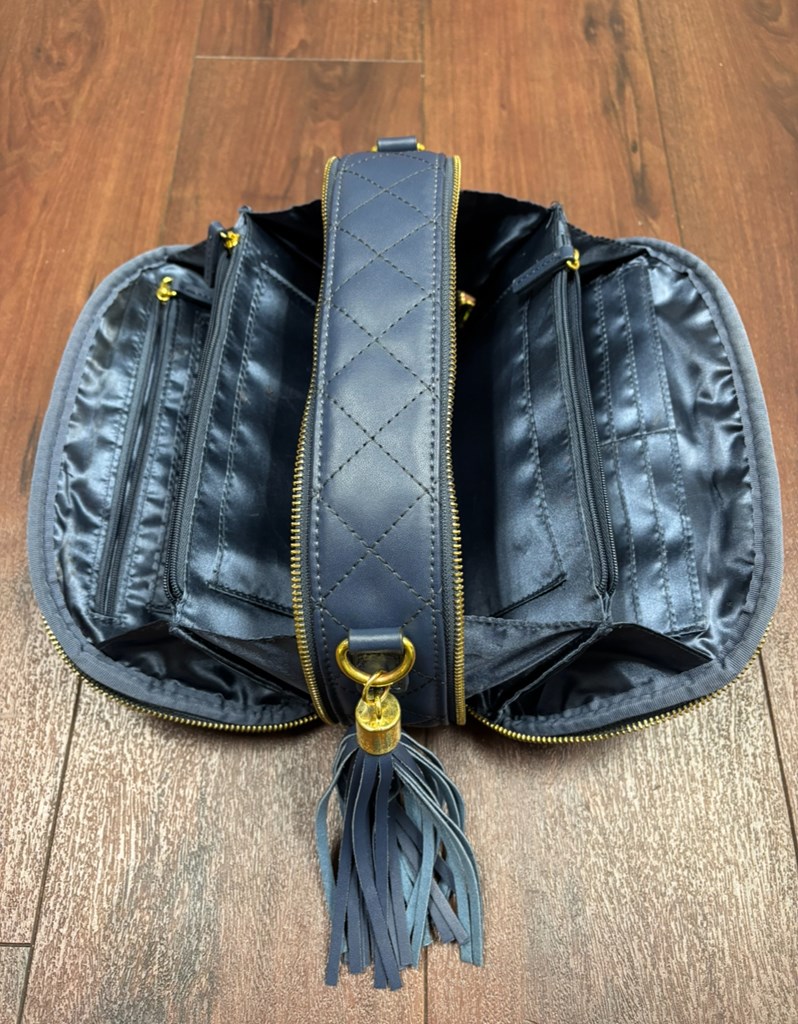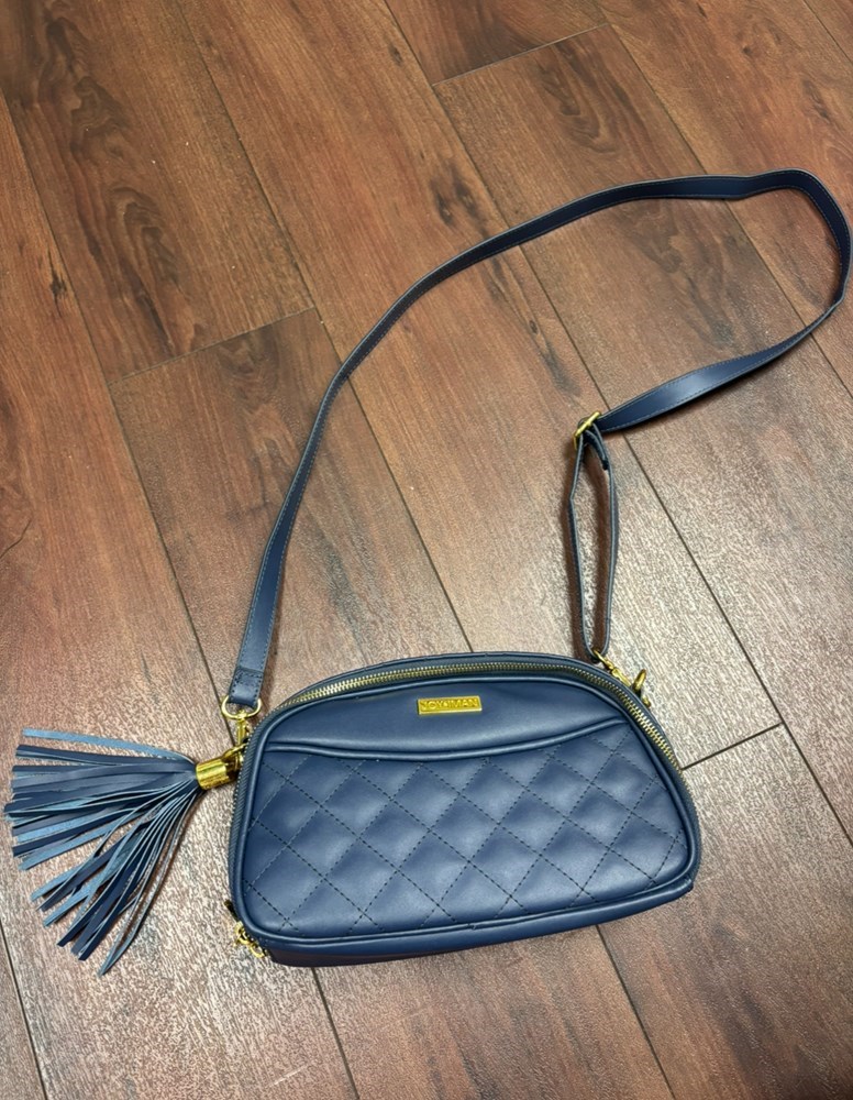 This navy blue Joy & IMAN purse parts into two large pocketed compartments on each side. It has detachable straps and a tassel decoration. In very good condition, with no tears or stains.