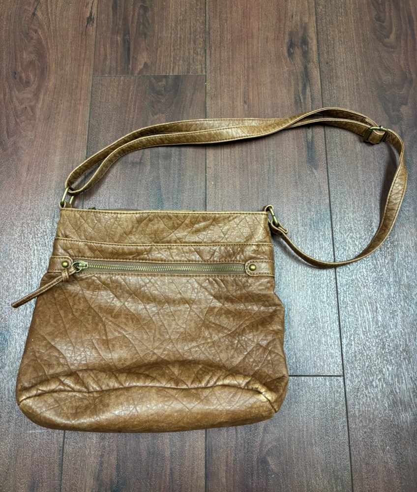 This leather purse is light brown with a zipper pocket in the front and pockets in the inside. It has detachable straps and is in very good condition.