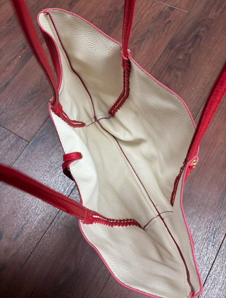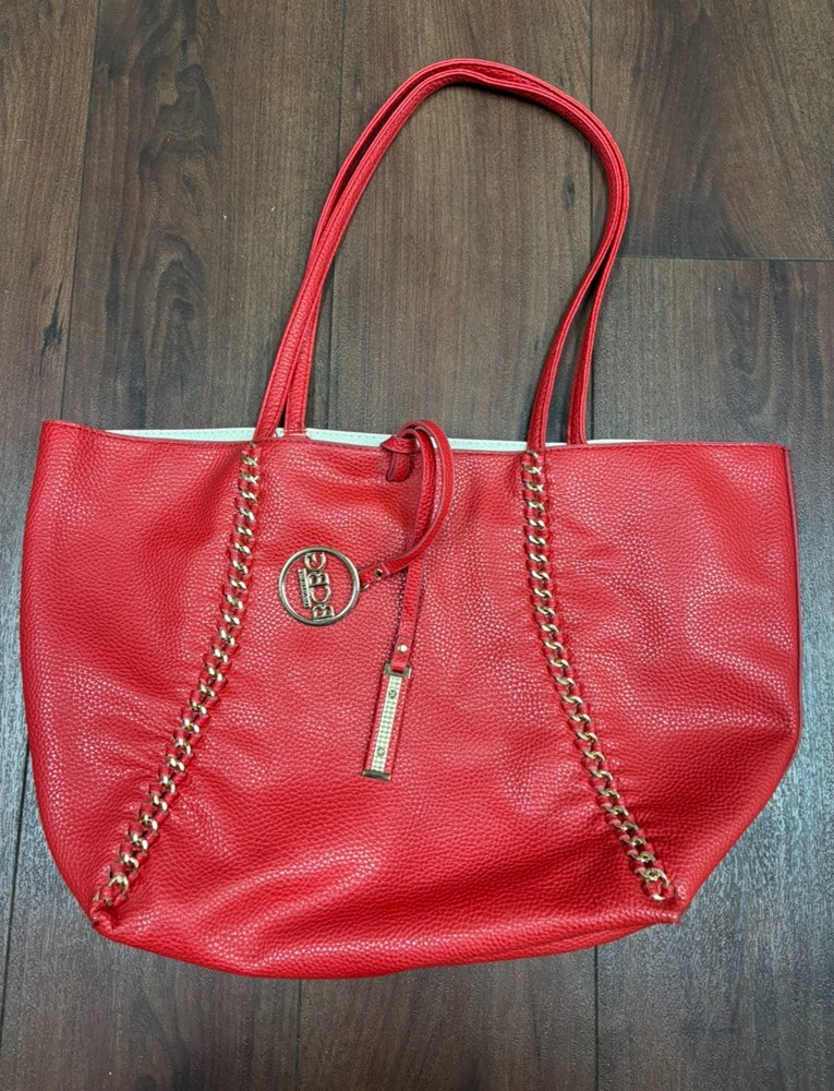 This BCBG Paris red bag has no pockets on the inside or outside but has a braided gold exterior and a large storage space. In very good condition.