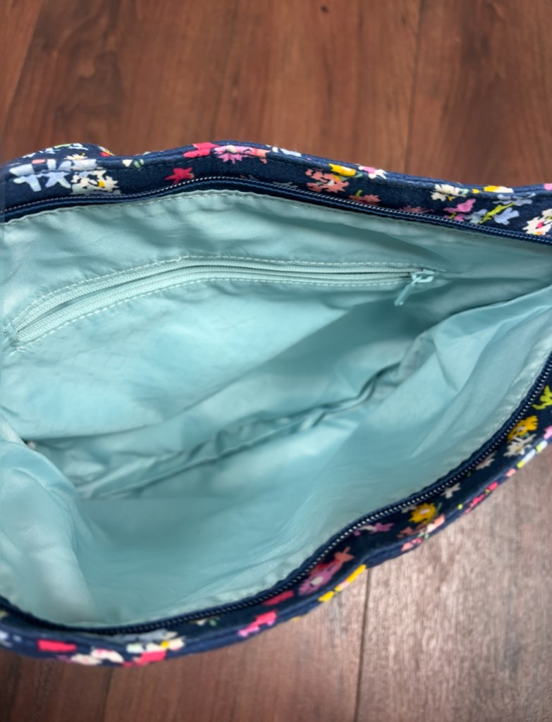 This Vera Bradley purse has pockets on both sides of the exterior and interior as well. It has a light blue interior. In very good condition.