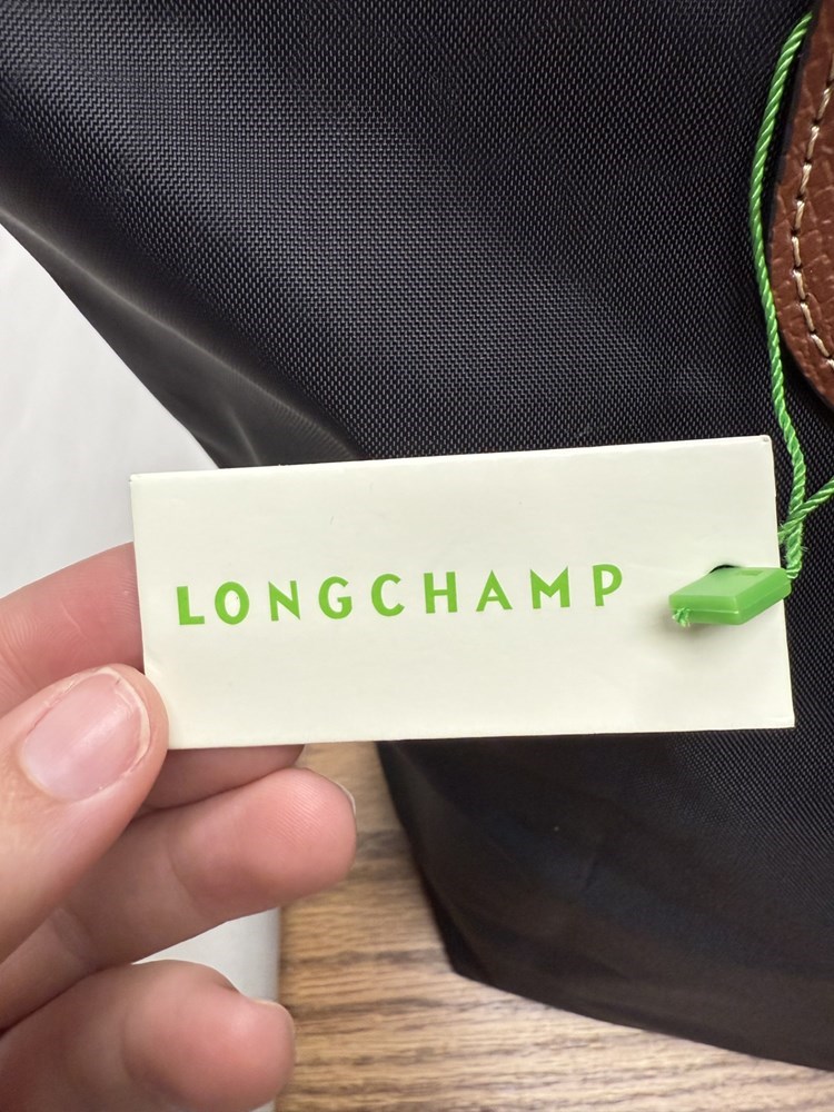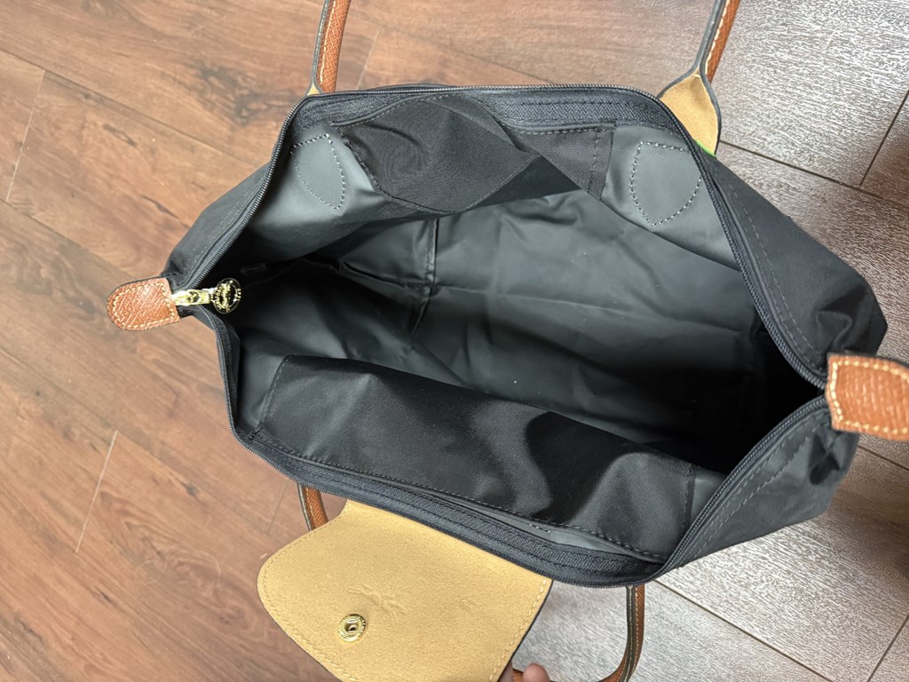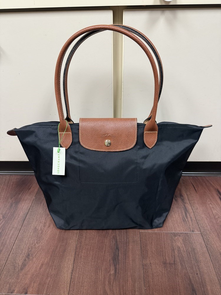Longchamp Large Le Pilage Tote - Black : 12"W x 12"H x 7"D. (Interior capacity: large.) 9" strap drop. .8 lb. Smooth, sleek nylon and embossed leather trim make this spacious tote a no-brainer for everyday versatility and elegance. An inside pocket is an organizational must-have, while the water-resistant finish provides enhanced utility for rainy days.