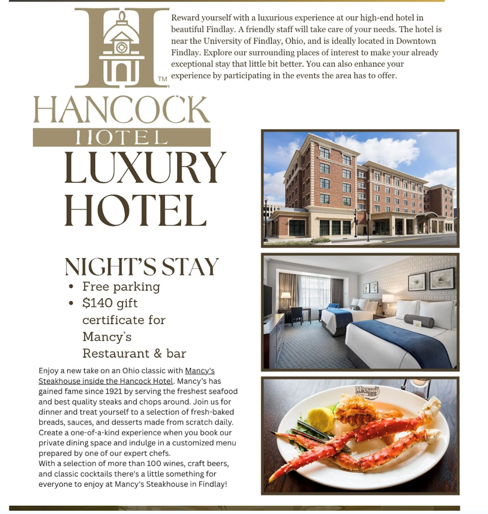 Night in Historic Hancock Hotel, includes $140 gift card to Mancy’s bar Retail Value: $300
