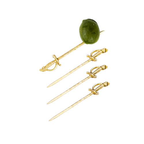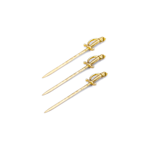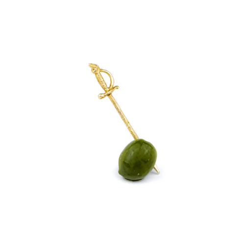 Elevate your cocktail hour with this striking set from Shelton Metal! This lot includes four sword-shaped martini olive picks, hand carved and cast in solid, non-treated brass, along with a jar of Zia Pia Italian imported olives. These sword cocktail picks are just missing olives and an extra dirty martini! The picks are crafted for both flair and function, and their solid brass construction will naturally patina and show wear over time, though they can be cleaned or polished to maintain their shine. Hand wash only. Perfect for entertaining, gifting, or adding a touch of sophisticated fun to your next gathering.