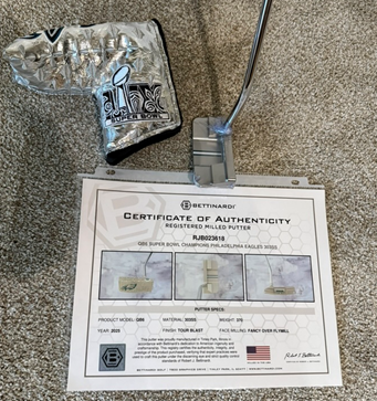 Super Bowl LIX Champions! To commemorate the Eagles historic victory, we precision machined this Philadelphia Eagles QB6 Putter with a sleek Diamond Blast finish, accented with midnight green and white paintfills. The sole proudly showcases the Philadelphia Eagles logo alongside the Super Bowl LIX emblem, making it a true collector’s piece. Milled from 303SS, it boasts a triple flangeline alignment and a Fancy over Micro Honeycomb™ face for a firm, yet responsive feel. The face of the putter is adorned with the Hex B on the heel, and in the pocket, you’ll find the Eagles wordmark in the pocket and the final score 40-22, on the right bumper. Elevate your game with this limited run putter that combines Bettinardi’s world-renowned design and precision milling with Philadelphia Eagles pride.