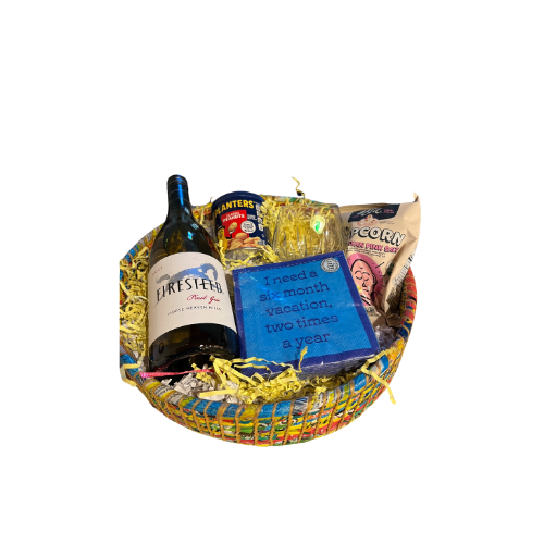 When the world feels a little too Monday, this basket is your ticket to an instant escape! Pour yourself a glass of crisp Firesteed Pinot Gris in a sparkling crystal stemless wine glass, grab a handful of popcorn, and let the fun cocktail napkins remind you that vacations can happen anywhere—especially at home. It’s a mini getaway in a basket, no plane ticket required!