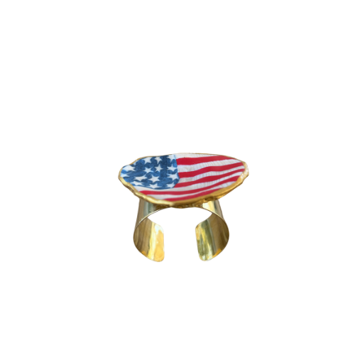 Make a bold statement with this truly one-of-a-kind oyster shell brass cuff bracelet, handcrafted by Lumina Luxe artist Laura Kay Berry. Featuring an intricately detailed American flag clay design set on the face of a natural oyster shell, this piece blends coastal elegance with patriotic artistry. Both wearable and collectible, it’s a stunning showcase of craftsmanship that celebrates individuality and style. Perfect for jewelry lovers, art collectors, and anyone who appreciates a touch of coastal charm with a story to tell.