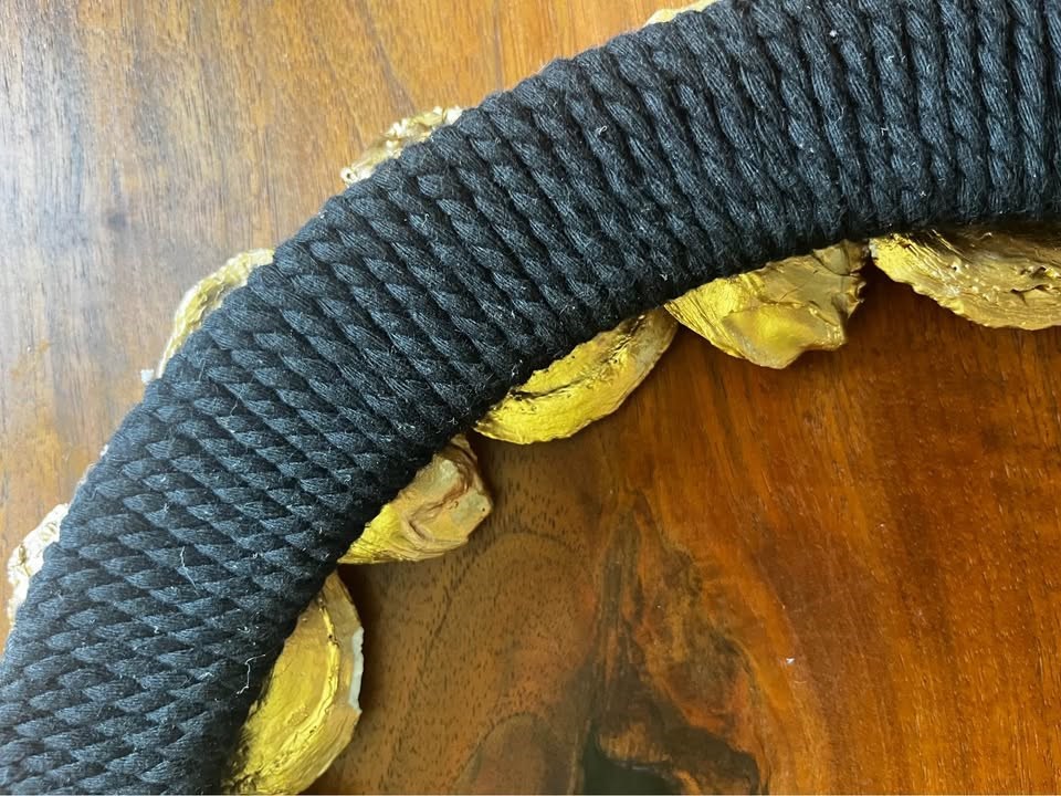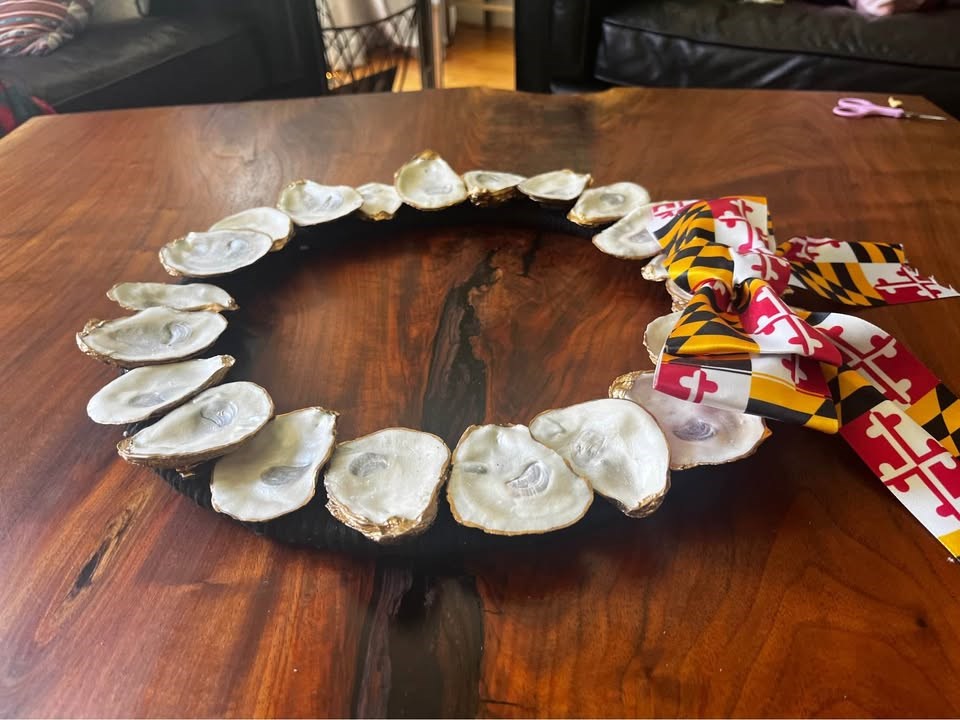Show off your Maryland pride with this beautiful handmade oyster shell wreath. Made with love and care, this handcrafted wreath is made from oyster shells backed and trimmed with gold leaf paint and a backing wrapped in black rope. Bid on this item to spruce up your own decor or use it as the perfect gift! Winner must be able to meet for local pickup in the DMV. Retail value: $60. Thank you to Designs and Finds by MA for donating this item. See more of her handcrafted works on \Etsy @ DesignsandFindsbyMA