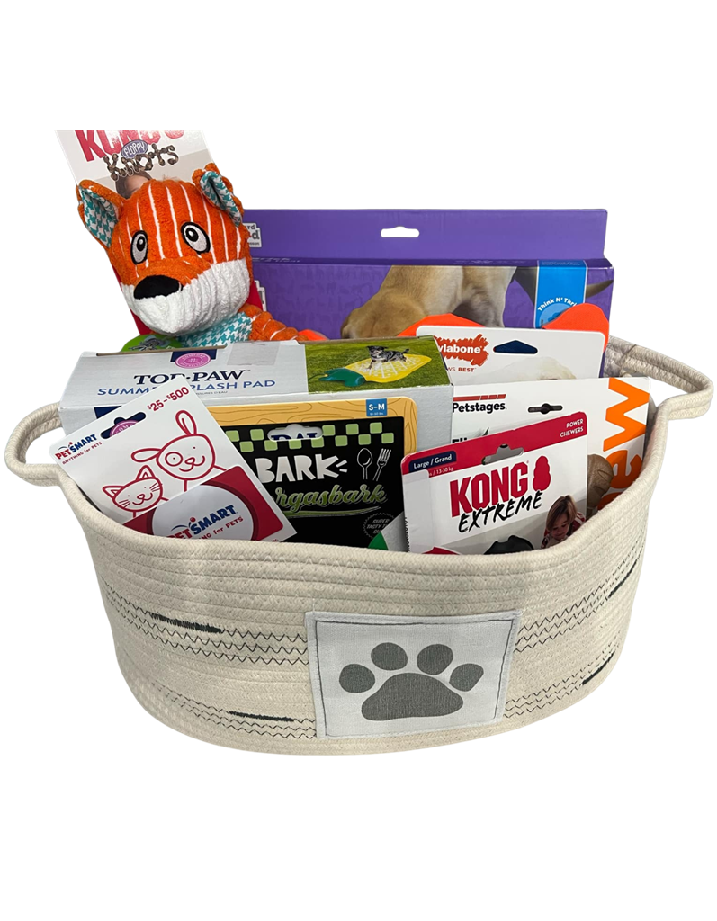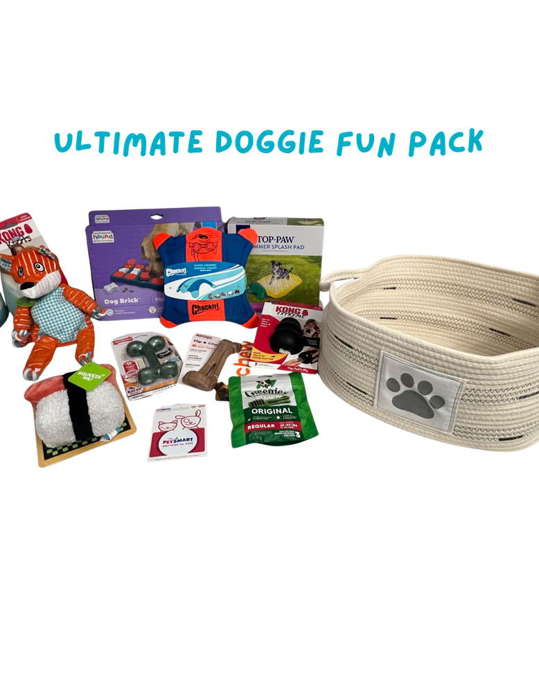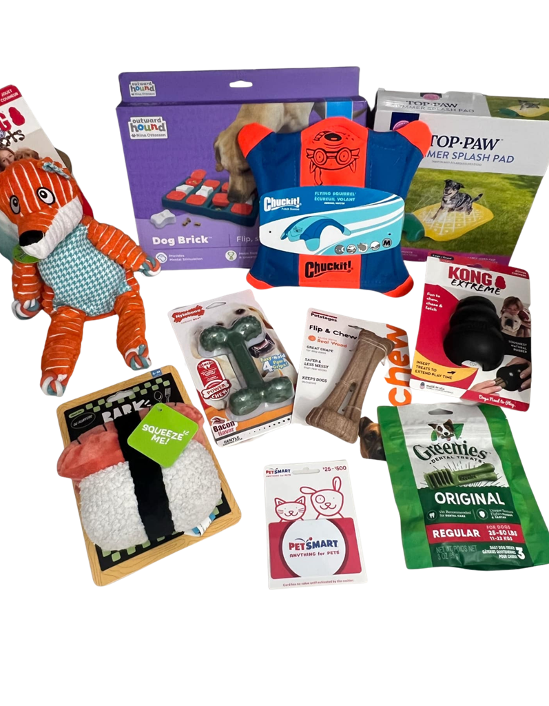 Treat your furry family member with this paws-itively awesome pet package! Whether you’re looking to train, play, or just spoil your pup, this bundle is packed with enrichment, fun, and tasty rewards. Includes: 🦴 $25 PetSmart Gift Card – pick up food, treats, or supplies 🦷 Greenies – dental chews your pup will love 💪 KONG Extreme – built for serious chewers 🌊 Top Paw Summer Splash Pad – keep cool and play outside 🛸 Chuckit! Flying Squirrel Toy – for active, airborne fun 🦴 Two Nylabones – great for chewing and dental health 🧩 Outward Hound Dog Brick Puzzle – mental stimulation at its best 🐻 KONG Knots Toy – soft on the outside, tough on the inside 🍣 Bark Squeaky Sushi Toy – adorable and fun for endless play Plus an adorable basket perfect for keeping your dog's many toys organized! Bid now and bring home the paw-fect prize! Retail value: $150. Winner must be able to meet for local pickup in the DMV.